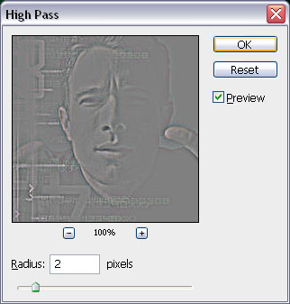 4. Now run the command, Filter >> Other >> High Pass. Type 2 in Radius and hit OK: