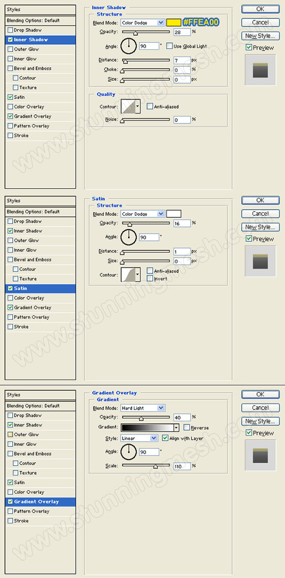 Apply an Inner Shadow, Satin, and Gradient Overlay layer styles to the horizontal orange rectangle layer.