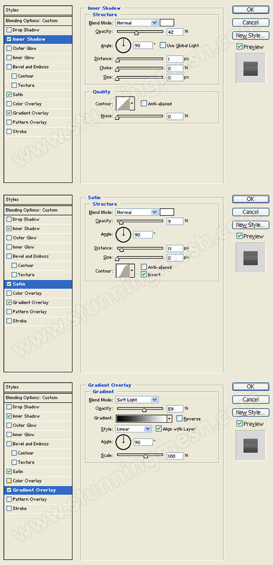 Apply an Inner Shadow, Satin, and Gradient Overlay layer styles to the horizontal white rectangle layer. Then, set the layer’s blending mode to Darken.