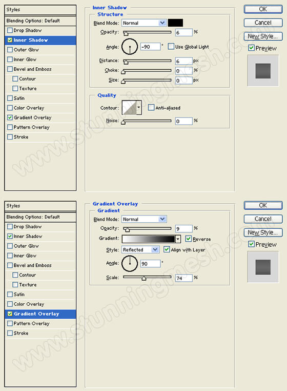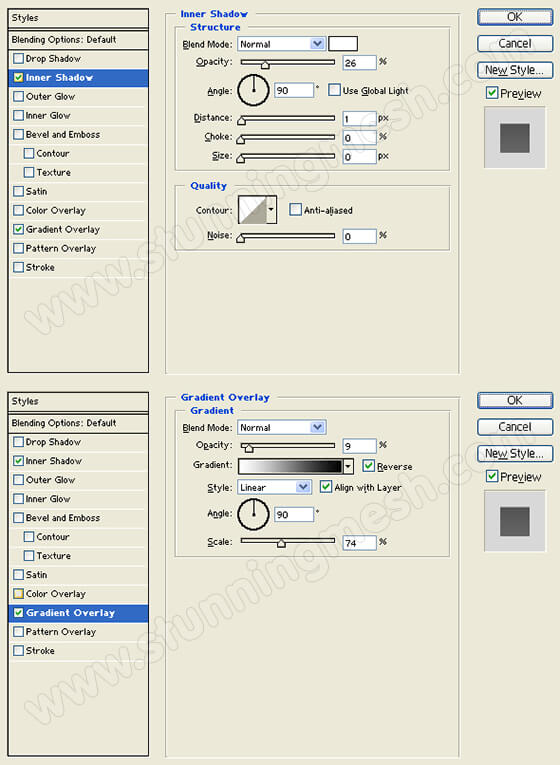 Add an Inner Shadow and Gradient Overlay styles to the orange tab layer. Use the settings provided on the step image below.