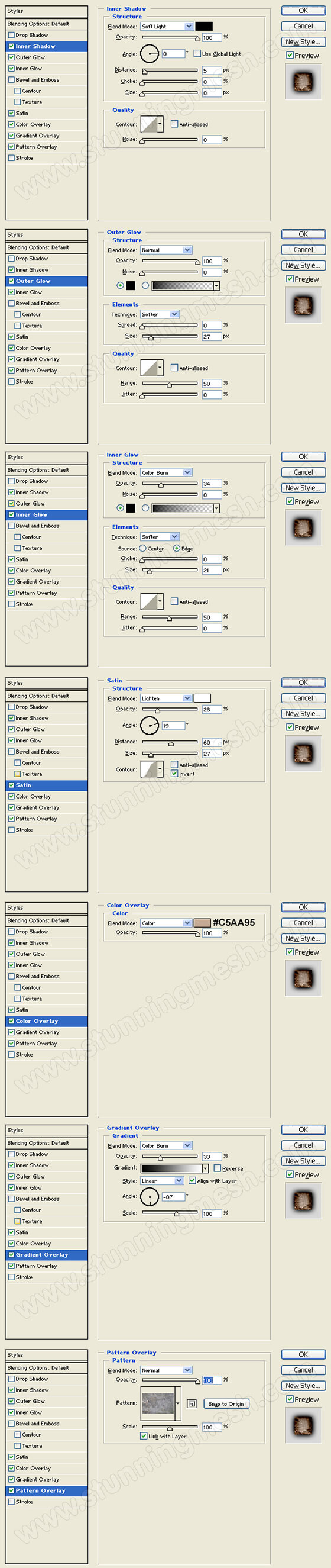 Under Layer Style (Layer > Layer Style) add an Inner Shadow, Inner Glow, Satin, Color Overlay, Gradient Overlay, and Pattern Overlay blending options to your text layer.