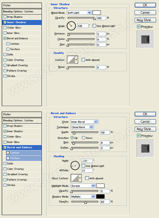 Under Layer Style (Layer > Layer Style) add an Inner Shadow, Bevel and Emboss blending options to your white text layer. On the Layers Window, set the layer’s blending mode to Darken.